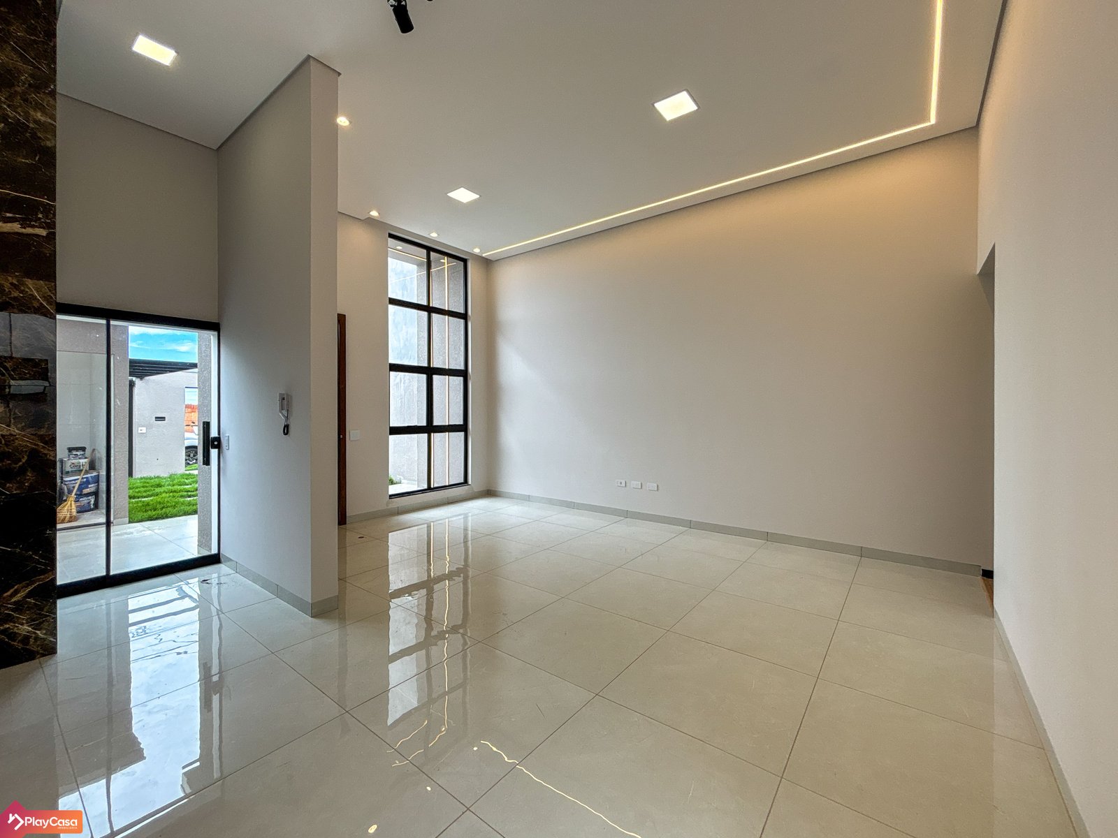 Sala com pé direito alto de 4m, gesso e iluminação em perfil de LED