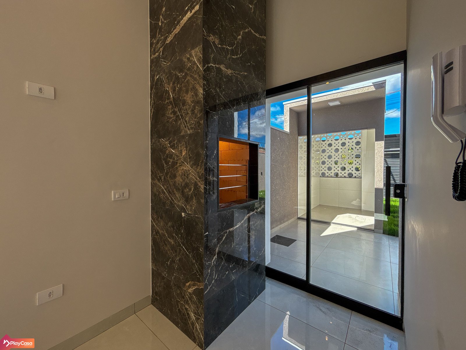 Área gourmet com churrasqueira, integrada à cozinha e área externa