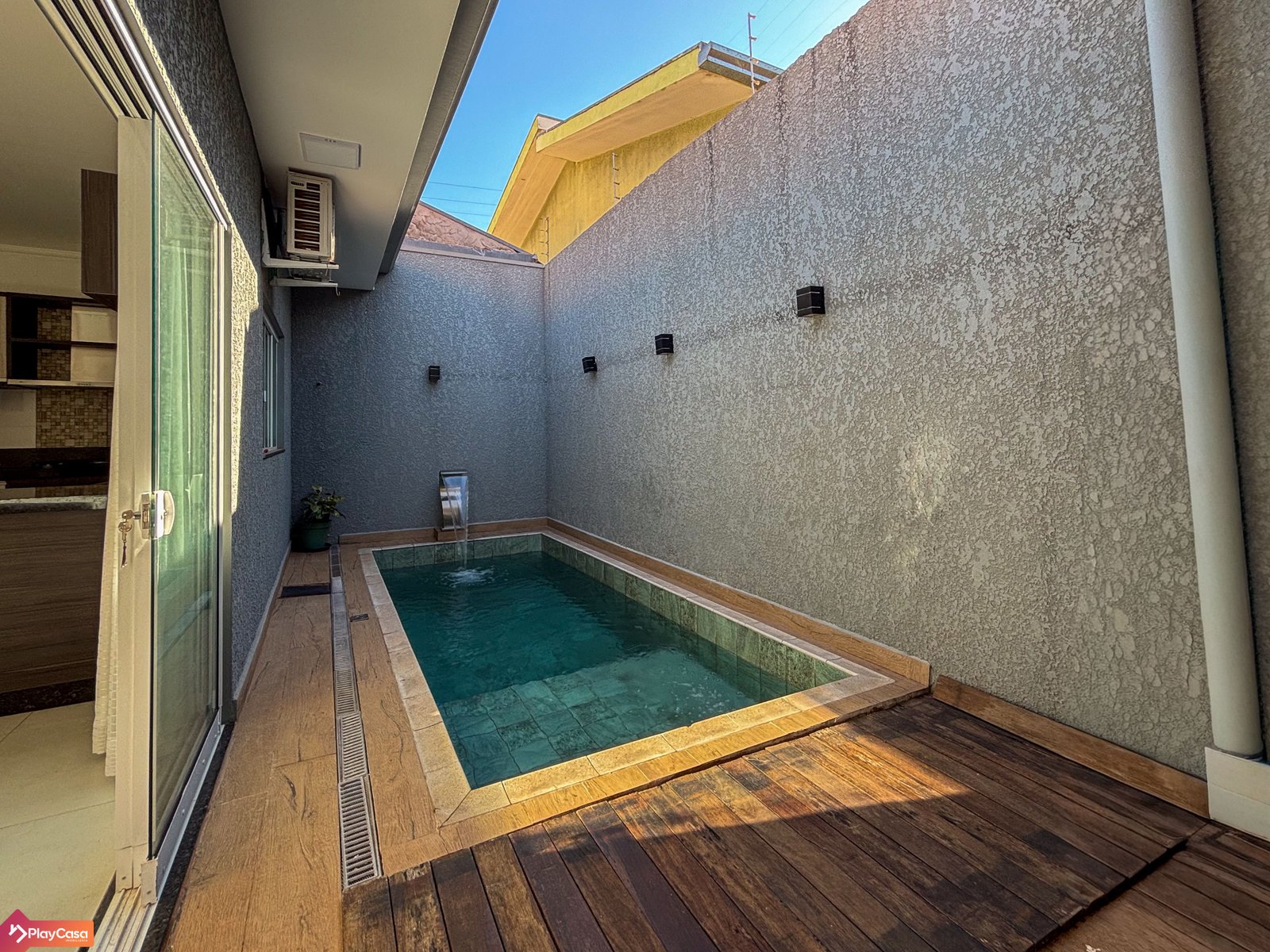 Destaque para a piscina aquecida com hidromassagem e cascata.