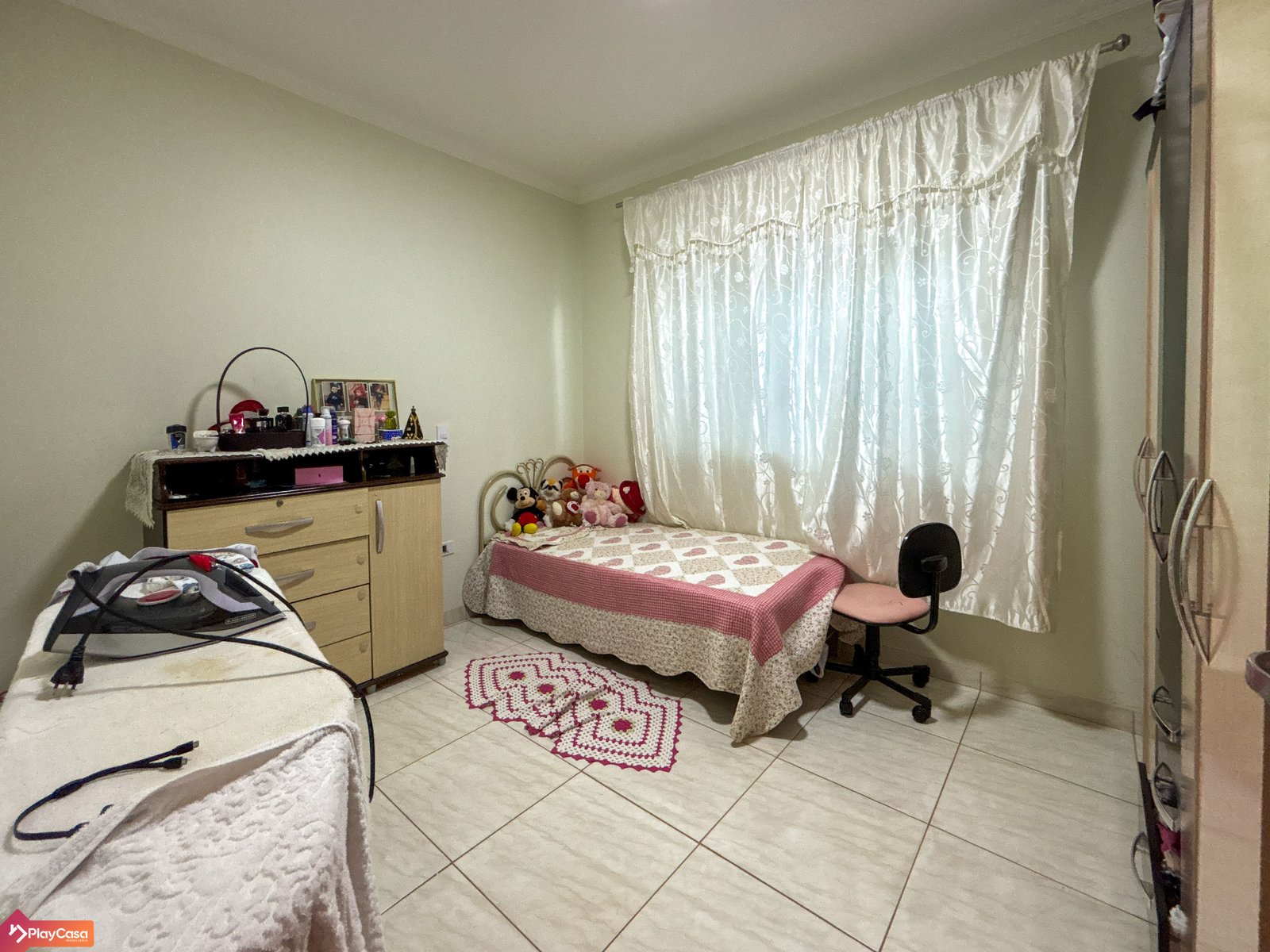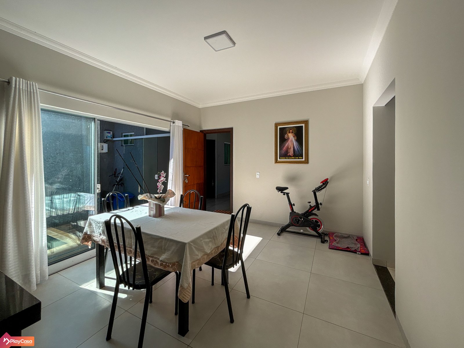 Imóvel com 3 quartos (1 suíte), sala separada da cozinha, cozinha planejada, banheiro social interno e banheiro externo, lavanderia e garagem coberta.